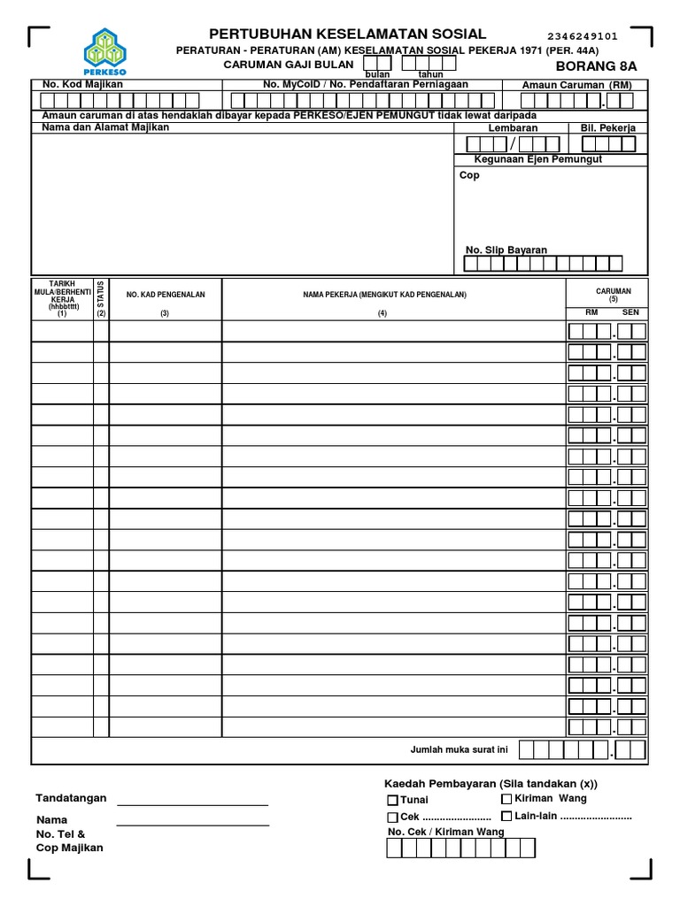 Monthly contribution form or form 8a in its physical form to employers. Anda boleh dapatkan borang 8a, borang acr/ecr dan resit bayaran. Download download borang rayuan bsh 2019 background. Free unlimited pdf search and download. Catatan (1) bayaran caruman pada setiap keping cek/kiriman wang/deraf bank hendaklah sama dengan jumlah besar di borang 8a bagi setiap bulan carum. Please find the following legal announcement from perkeso for requirement on borang 2 Perkeso borang 8a format baru download. This function generates a socso borang 8a form for each employee who has valid payroll results as determined by the payroll malaysia driver (rpcalcl0) for a specific. Sign, fax and printable from pc, ipad, tablet or mobile with pdffiller ✔ instantly. Due to the new field employment status in the new borang 8a and 8b, the old borang 3 does not serve any purpose anymore. Socso social security organization perkeso nbc com my. Borang excel skpmg2, borang excel, borang markah pbppp excel, borang tuntutan perjalanan 2020 excel, borang maklumat murid excel, borang skor kwsp 7 (borang e). This english perkeso assist video guide you on everything you need to know on the new perkeso assist for socso submission